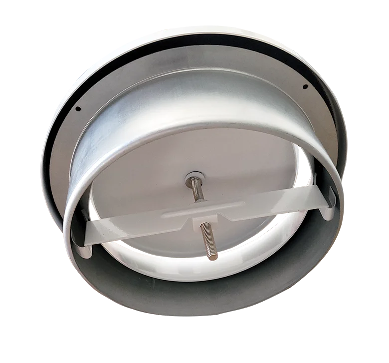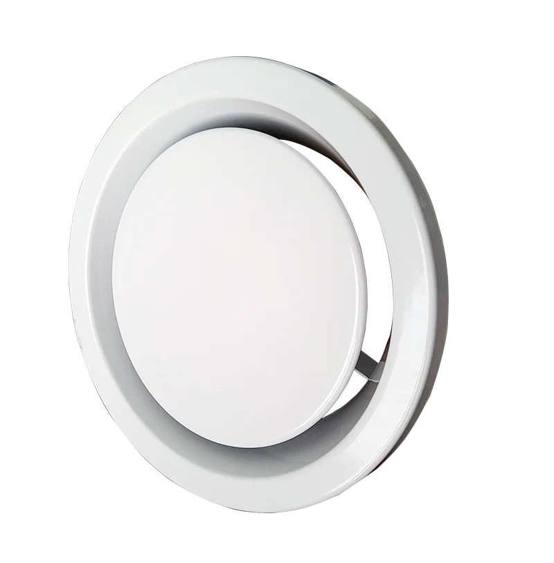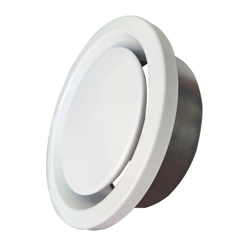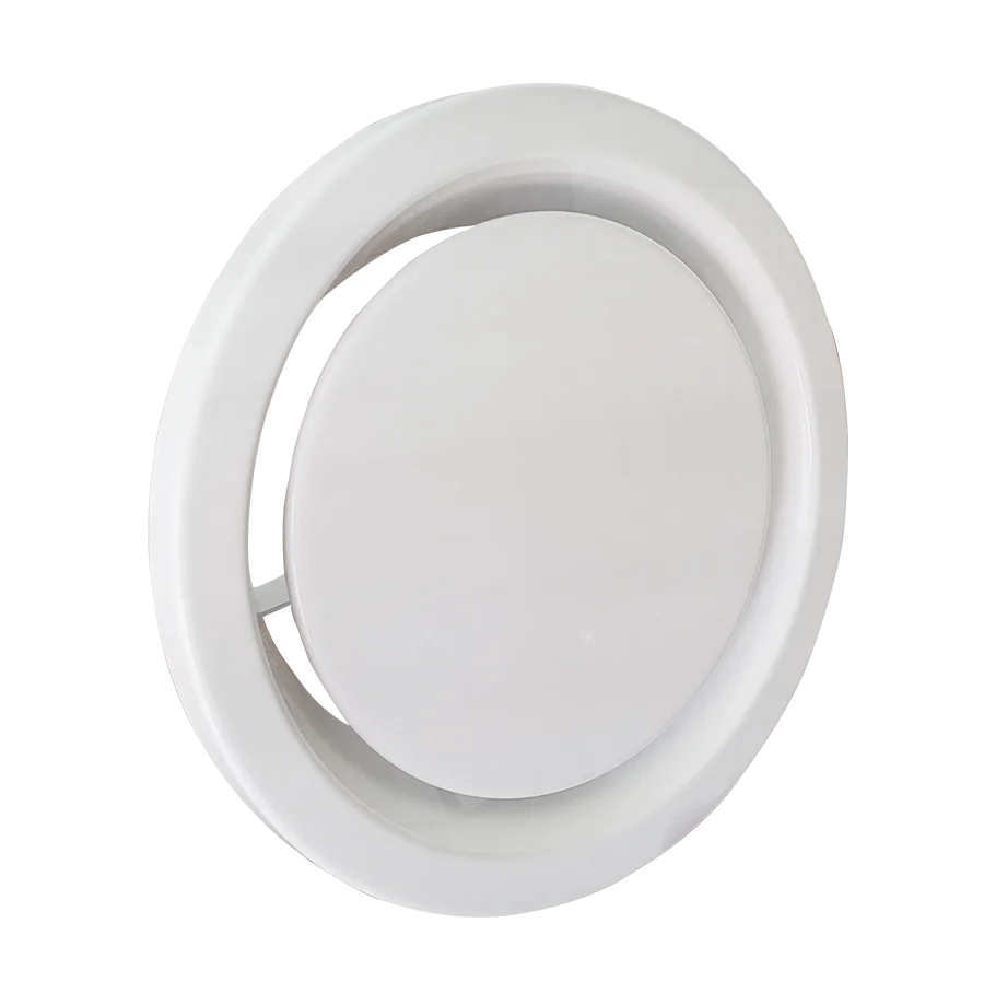 Valva de evacuare de tip scandinav Φ125 mm cu cadru alb lucios Supapă de evacuare proiectată pentru montare în tavan, din tablă de oțel zincată, vopsită cu pulbere alb lucios. Supapa este foarte bine realizata estetic si are un design modern. Corpul supapei este izolat fonic cu o garnitură din spumă, iar discul rotativ permite reglarea lină a fluxului de aer de alimentare și evacuare. Difuzoarele sunt echipate cu cleme metalice pentru montarea într-un cadru de montaj sau direct într-o conductă rotundă de ventilație. Există găuri pe cadru pentru înșurubarea pe tavan. Difuzor complet cu cadru de montaj echipat cu garnitura din spuma.